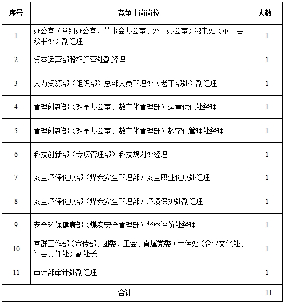 为进一步提升集团专业化管理水平。经研究决定,面向集团内部以竞争上岗方式补充集团办公室秘书处副经理等处室负责人11名。现将有关事项公告如下: