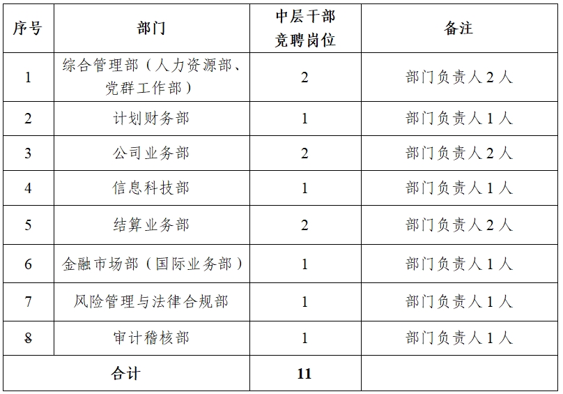 为了进一步加强干部队伍建设,激发干部队伍活力,经研究决定,中铝财务有限责任公司面向中铝集团内部以竞聘上岗方式产生综合管理部(人力资源部、党群工作部)、计划财务部等部门负责人11名。现将有关事项公告如下: